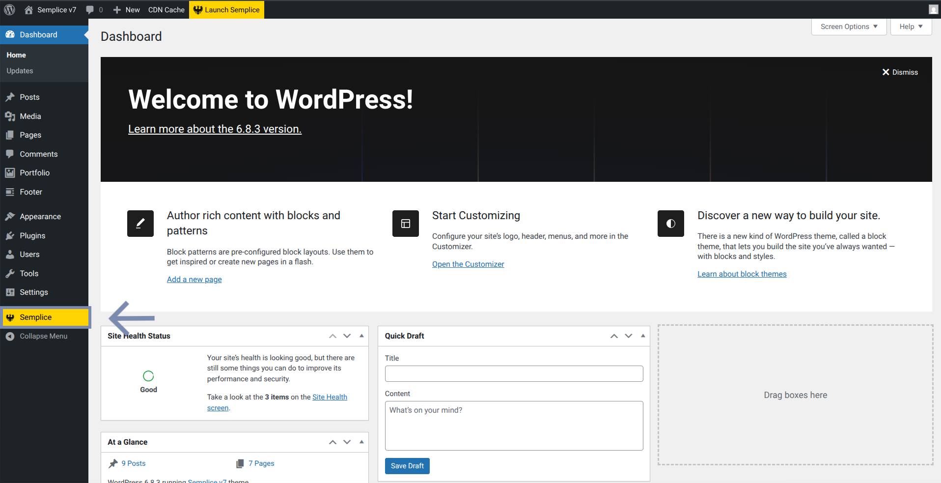In the WordPress dashboard, click on the Semplice button to enter the builder: