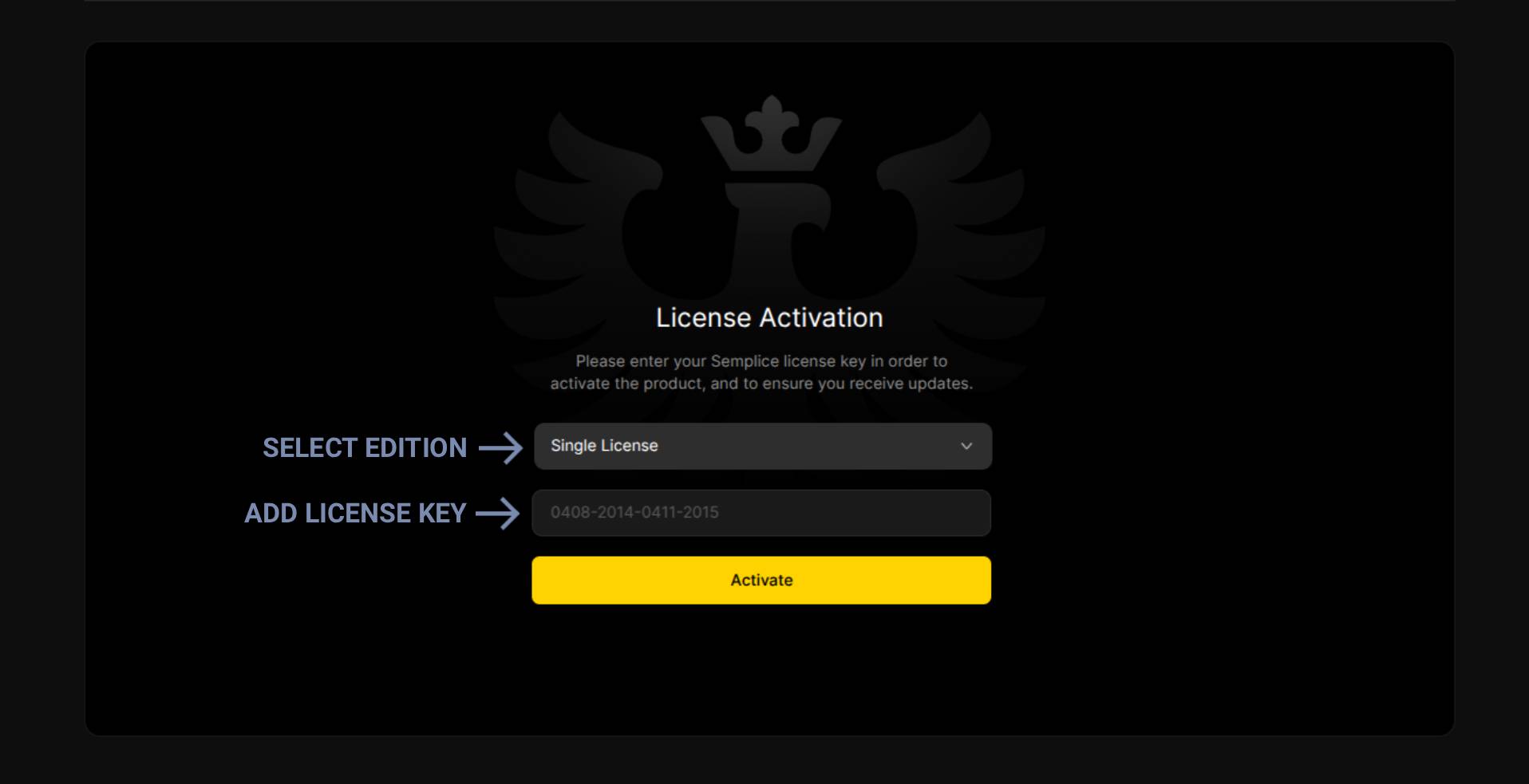 In Semplice, go to Settings > License and paste your license key in the field. Make sure it's in the right format with dashes.